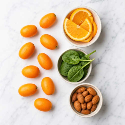- Agua infusionada: 4–5 kumquats cortados a la mitad en 1 litro de agua fría durante 2 horas = bebida hidratante y aromática sin azúcar añadida.